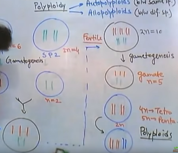 - 이게 번식가능한 케이스가 그 아래 서술된 amphidiploid (혹은 Allotetraploid, an interspecific hybrid having a complete diploid chromosome set from each parent form). 유전자 뻥튀기 덕에 2n = 10 even number가 되어 fertil한 개체가 되는 것. Wassermelon 을 예로 드네 여기선.
